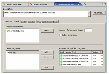 Now, we create one or more decisions. Decisions are things such as "Provide the best performing service provider", and take the metrics available for each service provider and apply weightings to them, so that for example we might place more emphasis at one point on keeping the customer satisfied with cost minimization a lesser goal; later on, we might define a new decision that changes the weightings and provides a service provider much more based on their ability to get to the customer on time.