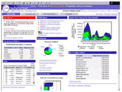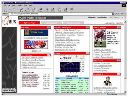 Version 2.0 of the nQuire Suite introduced nQuire Answers (the predecessor to Oracle Answers), with many of the features that we are now familiar with in Oracle Answers but with an additional emphasis on responding to English Language queries. Apparently in this initial release, you could pose questions in plain English such as "What were sales for the eastern region in the first quarter" and Answers would come back with a table of data - not something I've seen myself and I presume a feature that was eventually dropped when Siebel took the tool over. NQuire Suite 2.0, like version 1.0, ran exclusively on Windows NT and 2000 servers, was priced at $125k or £8k/month on subscription, and from the screenshot below, also came with the ability to create dashboards and portals to display the Answers requests, a feature that's clearly the predeccessor to what is now Oracle Interactive Dashboards.
