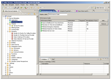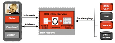 Another key concept in RTD is "informants". Informants are the interfaces into the Inline Service, and provide, for example, feedback on what the customer's call is actually about, whether they accept an offer, whether they take up the offer some time down the line and so on. All of the above elements, plus the informants and the predictive models, are built up using a tool called Oracle RTD Studio, a Java GUI based on the Eclipse framework that builds up an RTD project in much the same way that you'd build an OWB project, or a Java application.