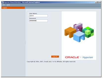 Once configuration is complete and everything has been set up correctly, I go over to my Web browser and go to http://localhost:58080/interop to check that Shared Services is working ok. Bringing up this web page then launches a Java applet that asks me for my Shared Services username and password, which on installation is set to the default values "admin" and "password".