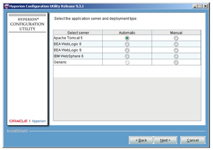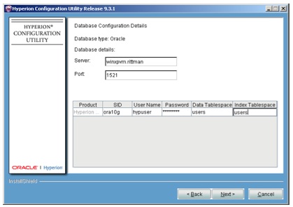 Shared Services provides user accounts, provisioning and other centralized services for the Hyperion System 9 platform of which Essbase is a part, and you need to install and configure this before installing Essbase proper. I therefore run the Hyperion Shared Services installer to install the Shared Services application, and then run the Hyperion Configuration Utility to set up the database and application server that Shared Services requires.