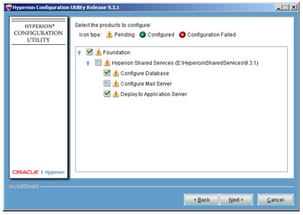I return now to the Hyperion Configuration Utility, click on the Hyperion Shared Services, Configure Database and Deploy to Application Server checkboxes, and press Next to start the configuration process.