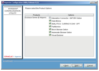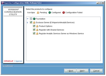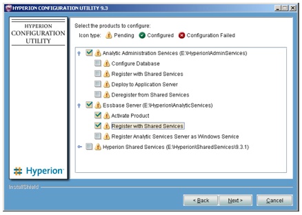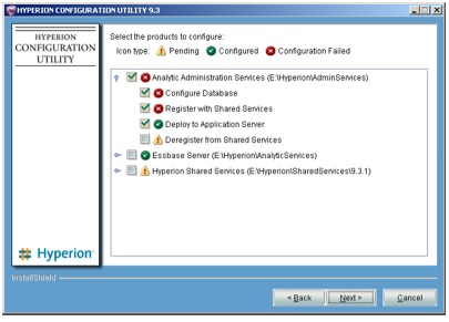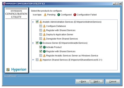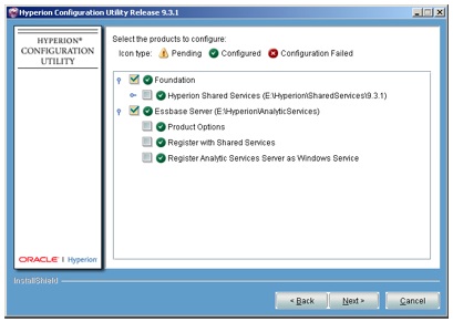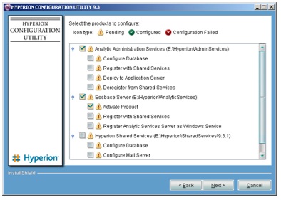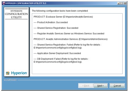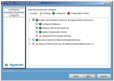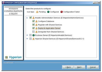 The application server deployment seems to have gone OK, but the database configuration and registration with Shared Services hasn't. Hmmm. Returning back to the Product Selection Page, I see that these products are now marked as in error. Maybe I should try and reconfigure Shared Services again (now, I'm guessing).