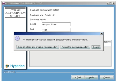 So what now? Should I drop the existing HYPUSER database schema, recreate it, and then redeploy Shared Services? Again, the docs don't mention this set of events, so I'm on my own here. I stop the configuration utility and then restart it again, and this time just try and configure the database for Shared Services, again it hangs and looking at the error log for the application, I get an error that doesn't really shed any light on what's happening.