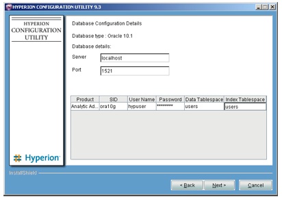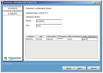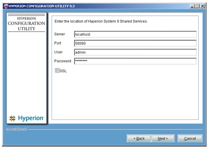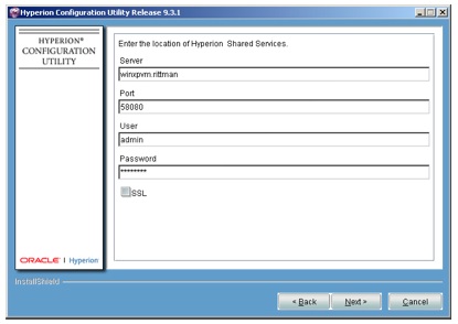 The next page lets me put in the connection details for Hyperion Shared Services, the component I set up yesterday.