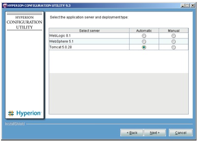 Now again, the docs don't really make this clear, but I'm thinking that you enter the same connection details in as I used when setting up Shared Services, i.e. both sets of tables go into the same schema. I enter the same details in and press Next, the choices seem to be accepted and then I then need to choose between Tomcat, WebSphere or WebLogic as the application server (note, no "Generic" option allowing me to install to Oracle Application Server). I choose Tomcat and automatic installation and press Next.