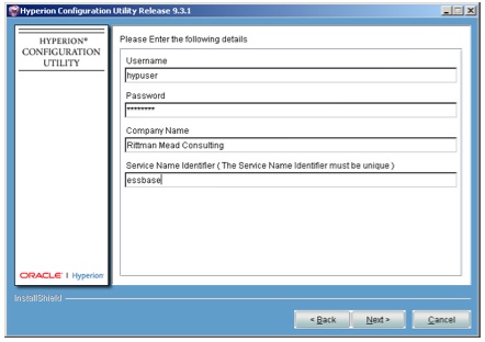 On the next screen, I enter "hypuser" and "password" as my Essbase username and password (I think?) Then I then put our company name in, and change the Service Name Identifier to "Essbase".