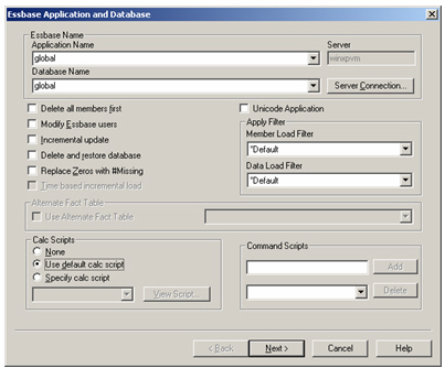 The console now shows a dialog that allows me to select the application and database to load data in to, and to select the calculation script to use – this bit is important, if you leave it at the default, your measures won’t get aggregated and all you’ll get is lots of missing values when you try and view the cube.