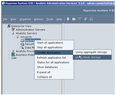 Before I can start loading up the cube though, there’s one more thing to do – actually create the OLAP database to put the cube in to. To do this, I start up Analytic Administration Services, log in as “admin”/”password” and navigate to the section where my Analytic Server (Essbase server) is located. I then right-click on it and select Create Application > Using Block Storage.