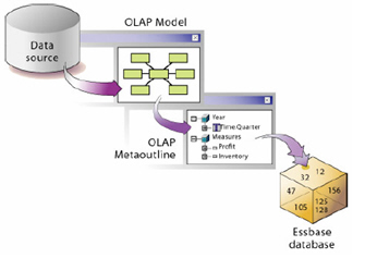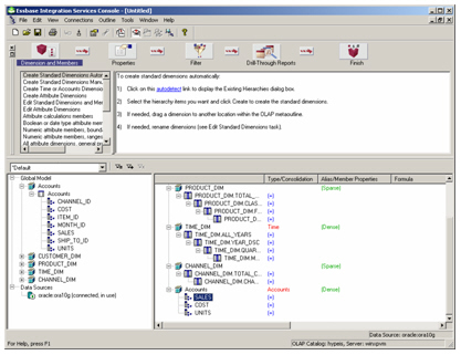 Although you can build Essbase cubes manually, as you can with Oracle OLAP (through OLAP DML or PL/SQL) and Express (Express SPL), there’s a tool called Hyperion Essbase Integration Services that does a similar job to Analytic Workspace Manager (AWM); you can define the dimensional model, add calculated measures and aggregation plans, map the cube to relational data sources and then load the cube and aggregate it. Integration Services is a little bit different to AWM in that it actually has a repository and runs as a mid-tier service, but the principle is pretty much the same.