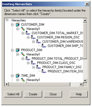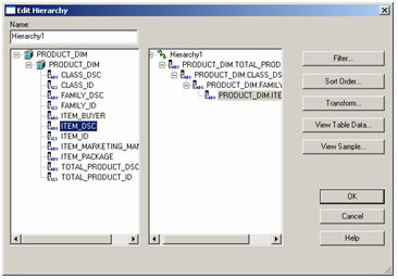 Now I need to create at least one hierarchy per dimension. I do this by double-clicking on each dimension, selecting the Hierarchy tab from the dimension properties dialog, and then selecting the dimension members in much the same way as AWM or Discoverer Administrator.