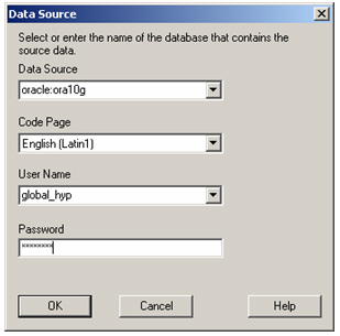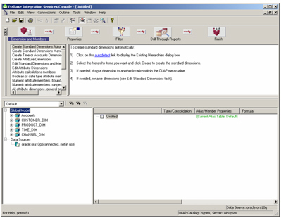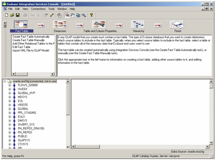 The first thing that’s displayed is a dialog asking me for details of a data source. Using this dialog, I can either enter the details of an ODBC connection, or an Oracle connection string if I use the prefix “oracle:”. I’ve copied the Global Electronics tables into a separate schema called GLOBAL_HYP, so I put in the details for this schema and press OK to connect to the database and open the Integration Services Console.