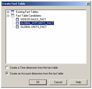 I then select the UNITS_FACT table from the global schema, uncheck the time dimension checkbox (I’ll create this manually in a second) but leave the account dimension checkbox ticked – account dimensions are “dimensions of measures” that Essbase sets up, I might as well get the tool to create this as it’s just a case of create it and leave it, you don’t do much with it afterwards (at least I don’t think you do).