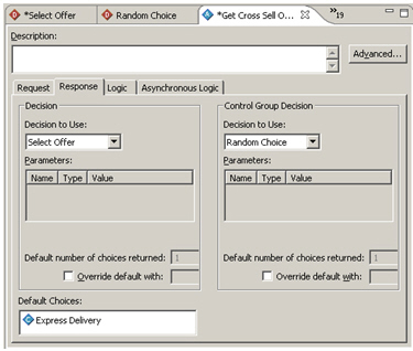 Now that I've created the decisions, I need to create an "Advisor" to send the offer recommendation back to the client. I therefore create an Advisor called "Get Cross Sell Offer", select the predictive model decision and the control (random) decision, and then picked the extended warranty choice as the default offer.