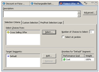 I'm now at the point where I can create my first "decision". Decisions use one particular set of performance goal weightings and feed back to the calling application the decision made by RTD. I create a new decision and call it "Cross Selling Offer", I point it towards the cross-selling choice group, and place a 100% weighting on the cost reduction performance goal. Note how I can segment customers within this dialog - later on, I'll use this to apply different weightings to different groups, emphazing cost reduction more for silver and bronze customers.