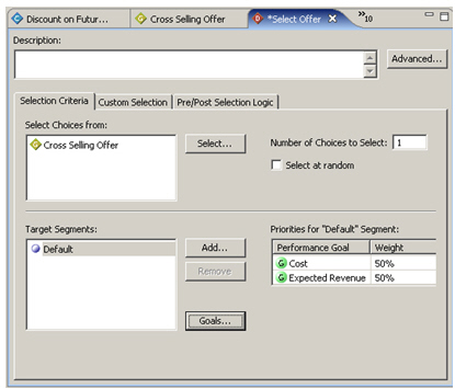 Then, I go back to the score setting for the Cross-Sell Offer choice group and add in this performance goal, and set the scoring algorithm to multiply the base revenue for each choice by the chance of each choice actually being accepted, which is a value between 0 and 1 (0% and 100%)