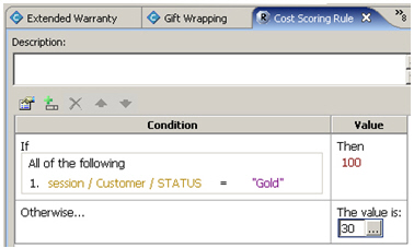 To do this, I define a scoring rule that implements a condition that sets cost to 100 if the customer status is Gold, otherwise it sets it to 30, like this: