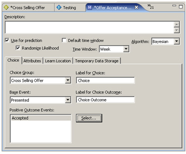 So, now to create the associated Choice Event Model. I call the model "Offer Acceptance Predictor", associate it with the set of cross-selling choices, give it a window of a week to base it's predictions on (i.e. disregarding choices made more than a week ago), and tie it into the presented and accepted choice events I defined a moment ago.