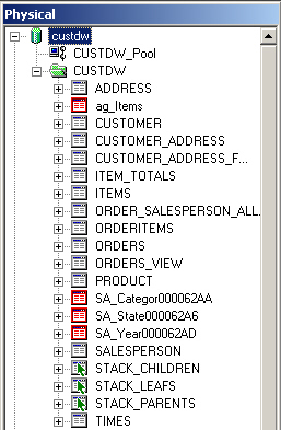 Looking at the Physical Layer in the BI Administration tool, I can see the new aggregate tables created and registered, and shown in red to show they're aggregates.