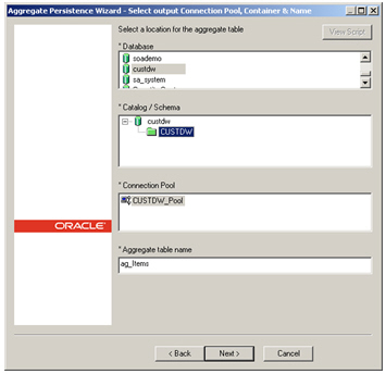 Now you choose the database in which you'll store the aggregates. In this initial example, I'll stored the aggregate tables in the same Oracle schema as the source data, but I could just as well store them in an Access database, or an SQL Server database, if I had one handy.