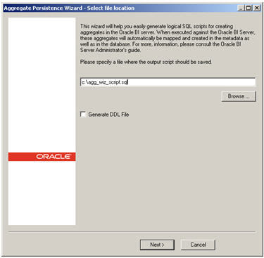 To start off then, the first screen displayed by the wizard prompts you to enter a filename for the script it's going to generate. Note the option underneath to generate a DDL file as well - this is a bit of a red herring, as the main script that it generates already tells the BI Server to generate back-end database tables anyway, I'm not quite sure what the DDL file is for but it's definately not needed for what we're doing.
