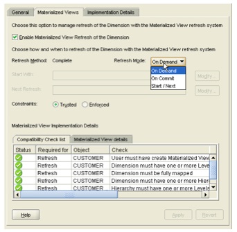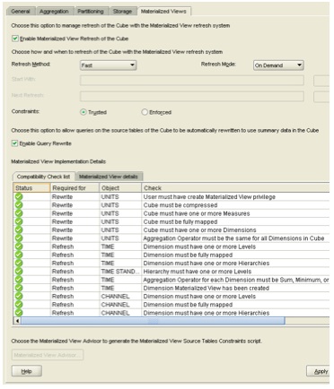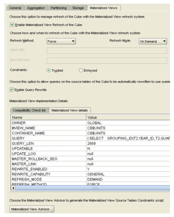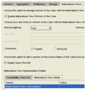 On this tab, you can enable the cube for MV refresh, set the refresh method and refresh mode, and also enable it for query rewrite, so that the analytic workspace is considered when queries come in against the source tables used to populate it.