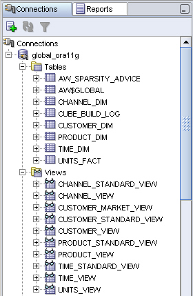 The first thing I notice is that the views over the AW dimensions and cube have been built automatically. In AWM 10g, you could do this through a plug-in to AWM, in Oracle Database 11g the views are created automatically (plus the types that you need to make the views work) whenever you create AW objects using a tool such as AWM (the magic is done I think through AW/XML, the Java API for maintaining AWs, I guess if you just went in to the OLAP Worksheet and typed in OLAP DML to create a dimension, this wouldn't happen).