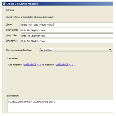 To go back a year, I'd have to change the "1" at the end of the calculation to "12", as the lowest level in the TIME dimension is month, and I need to go back 12 months. If you look underneath the calculation, there's an expression displayed that corresponds to the calculation I've just defined: