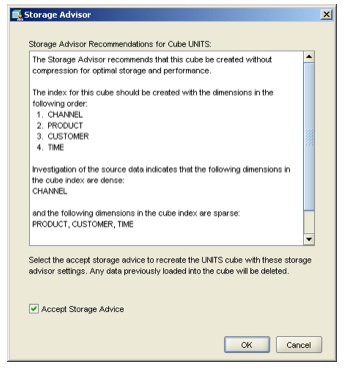 Curious. This must be like the old Sparsity Advisor in 10gR2, which actually samples the source data and calculates the actual sparsity value for each dimension. The recommendation is interesting though - first of all,not using compression would stop me using materialized views, which would be a shame, but I wonder why it didn't recommend using compression in the first place - the data is sparse (it's sales performance data, which is usually sparse, as compared to accounts type data, which is usually dense) and there's usually little downside at all to using compression, even if your data is fairly dense. Interesting.