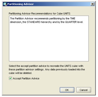 "The Partition Advisor recommends partitioning by the TIME dimension, the STANDARD hierarchy and by the QUARTER level."