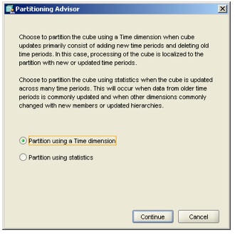 The message on the dialog reads: "Choose to partition the cube using a Time dimension when cube updates primarly consist of adding new time periods and deleting old time periods. In this case, processing of the cube is localized to the partition with new or updated time periods. Choose to partition the cube using statistics when the cube is updated across many time periods. This will occur when data from older time periods is commonly updated and when other dimensions commonly changed with new members or updated hierarchies"