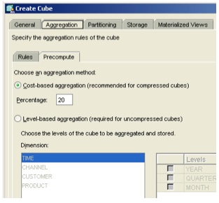 I next create the cube, calling it UNITS, and take a look at the new features in the Create Cube dialog. The first thing I notice is that the Aggregation tab now has two sub-tabs, "Rules" and "Precompute". The rules sub-tab has the same features as previous AWM versions (set the aggregation order and method), however the new precompute tab now offers the ability to precompute by levels, as per previous AWM versions, or by percentage of the cube, which is new.