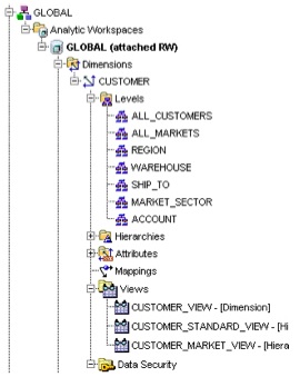 So I start off then by creating the CUSTOMER dimension in the Global model, which I create in exactly the same way as with earlier versions, starting first with the dimension, then the levels, then the hierarchies, and finally the mapping. What's new about this version though is firstly a new "Materialized View" tab within the dimension dialog, secondly a new "Views" entry under the dimension listing and thirdly an entry under the views, called "Data Security".