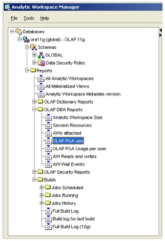 The OLAP_USER role is required in order to access the OLAP metadata in the Oracle database, whilst the CREATE MATERIALIZED VIEW role is needed in order to access the materialized view functionality now available in Oracle OLAP 11g and Analytic Workspace Manager 11g. The OLAP_XS_ADMIN role is new with 11g and, as we'll see later, is used when working with cube security in AWM.