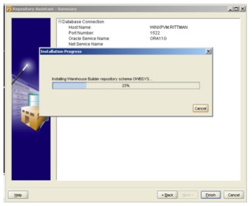Watching the progress bar, it looks like the wizard is actually installing the OWBSYS schema now, I wonder if it waits for the first person to run this wizard before it puts the repository tables into OWBSYS? I'll have to create another workspace later on, see if it goes through the same steps.