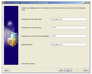 The next page asks me to enter the username and password of a DBA account (I use SYSTEM) and then asks me for three bits of information : the new user account's username and password, and the name of the workspace (a repository in old terms, but stored as a sub-repository in 11g's central OWB repository). I call the new user OWB_REPOS_11g and give the workspace the same name.