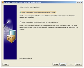 The next page gives me the option to create a new workspace with a new user to own it, or to create a workspace and have an existing user own it. As I said, what I think is happening here is that a logical sub-repository is being set up in the central repository, and an Oracle account is being set up to own this sub-repository. In a second I'll take a look at the user account that's been created, I suspect it'll be otherwise empty and will just have permissions on the new repository workspace.