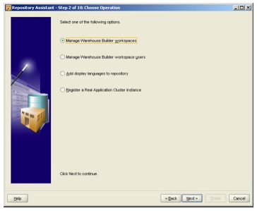 On this page, I can either manage a workspace, manage a workspace user, add languages to the repository or register a RAC instance. Now I think that what's going on here is that I can add multiple workspaces to the same, single repository, add a language to this single repository, and make it work with RAC, so I choose the first option and manage a warehouse builder workspace. The next page gives me the option to create a new workspace or drop an existing one, so I choose the first option and create a new workspace.