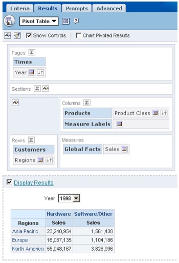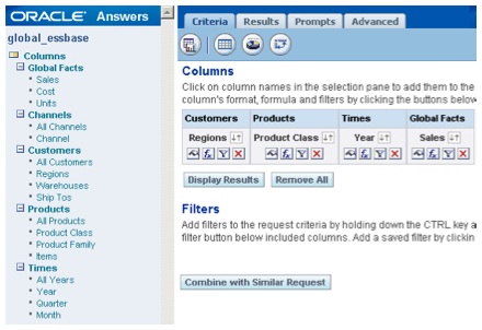 Now, after I save the changes to my repository, I can go over to Oracle BI Answers and put together a request against this new subject area. Oracle BI Server and Oracle BI Presentation Server makes the Essbase data look just like relational data, and I can build requests up using my Essbase data just like any other data source.