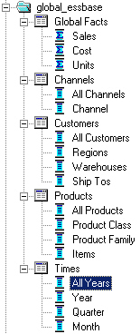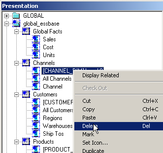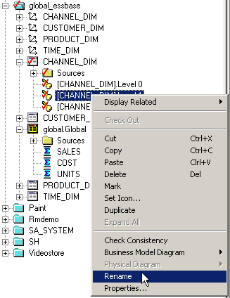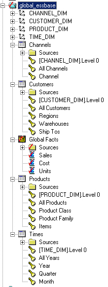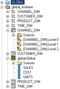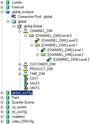 Notice how the icons for dimensions, cubes and hierarchies are different than for physical relational tables and columns - Oracle BI Administrator handles multi-dimensional data sources as first-class, native objects and automatically understands the dimensional structure of the cube.