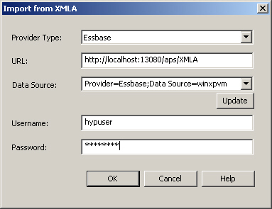 Once you enter the URL details, press the Update button for Oracle BI Server to auto-complete the Data Source field. Then, type in the username and password for your Essbase server (by default, this is hypuser/essbase, make sure you don’t enter the Shared Services login which by default is admin/password), and press OK to make the connection.