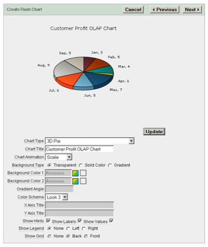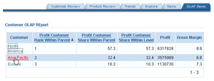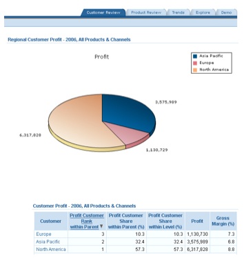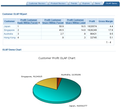 Notice how I'm filtering again on the :P5_CUSTOMER item, so that the chart will show the profit breakdown of customer dimension member that's been selected in the report, i.e. the report and chart are linked. Now, when I finally display the flash chart, together with the report, they're in sync and accessing data from the analytic workspace.