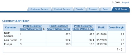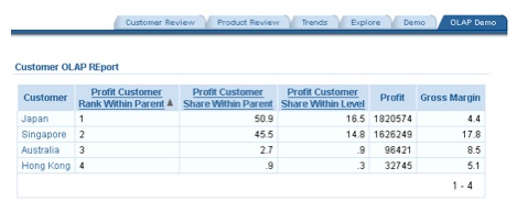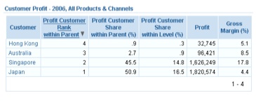 select cu.long_description customer, cu.dim_key customer_key, cu.parent customer_parent, round(f.profit_rank_cust_sh_paren,0) prof_cust_rank_parent, round(f.profit_share_cust_sh_pare,1) prof_cust_sh_parent, round(f.profit_share_cust_sh_tota,1) prof_cust_sh_level, round(f.profit,0) profit, round(f.gross_margin,1) gross_margin FROM time_calendar_view t, product_primary_view p, customer_shipments_view cu, channel_primary_view ch, units_cube_view f WHERE t.level_name = 'CALENDAR_YEAR' AND t.calendar_year = 'CY2006' AND p.dim_key = 'TOTAL' AND cu.parent = 'TOTAL' AND ch.dim_key = 'TOTAL' AND t.dim_key = f.time AND p.dim_key = f.product AND cu.dim_key = f.customer AND ch.dim_key = f.channel