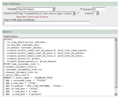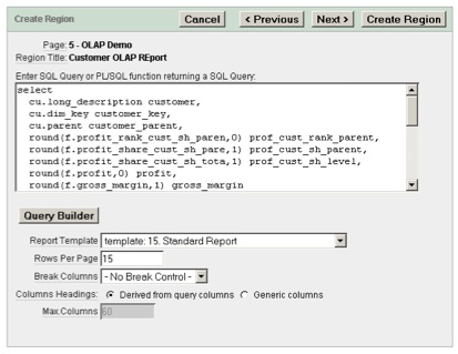 I now create a new Region, and make it of type Report / SQL Report. I give the report the name "Customer OLAP Report" and enter the SELECT statement above to generate the report data.