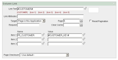 I then define the link as displaying the name of the customer (which again, might be a region, or a country, or a customer), and when clicked, passes the value of the Customer Key to the P5_CUSTOMER item that I've just defined, and navigates to the same page in the application.