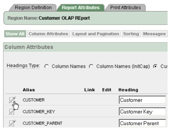 To populate the item at click time, I go back to the report definition, click on the Report Attributes column, and click on the Customer column to define the link it's going to use.
