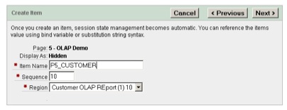 To do this, I first go back into the page definition and create a new item. I select type "Hidden" and call it P5_CUSTOMER (the page number is 5, hence the name)