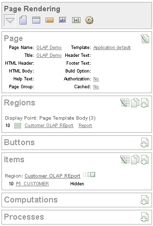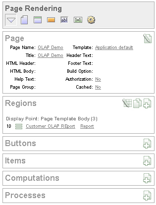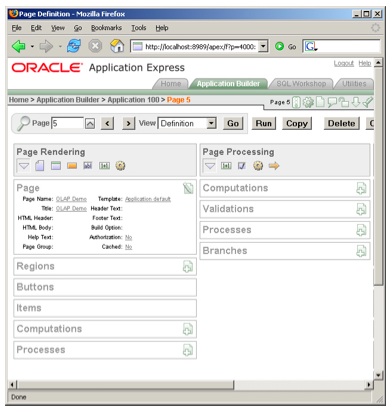 Within ApEx, I took the demo put together previously and within the application created a new page component. I selected "Blank Page" as the page type, accepted the page number ("5") and gave it an alias "olap_demo". I then named the page "OLAP Demo" and added it to the existing tab set. After allowing ApEx to create the new page, I'm presented with the follow page edit screen.