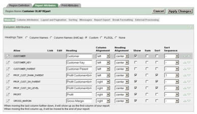 If I now go back into the report definition and click on the Report Attributes tab, I can fine-tune the display of the column names, orientate the headers and data either left or right, and - this is an important bit - hide the second and third columns in the report, "customer key" and "parent", as these will in fact be used for the drill-down navigation later.