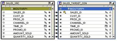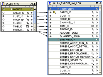 The mapping itself performed the same load logic as the SQL statements beforehand. For the mapping that was going to use DML Error Logging, I just copied the columns from the source table into the target table, like this: